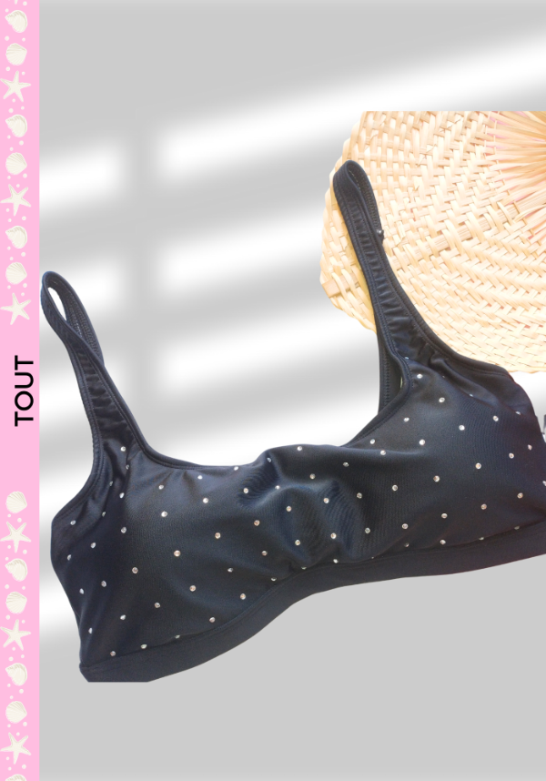 Corpiño tipo top con bretelws regulables anchos, forrado y tazas desmontables.