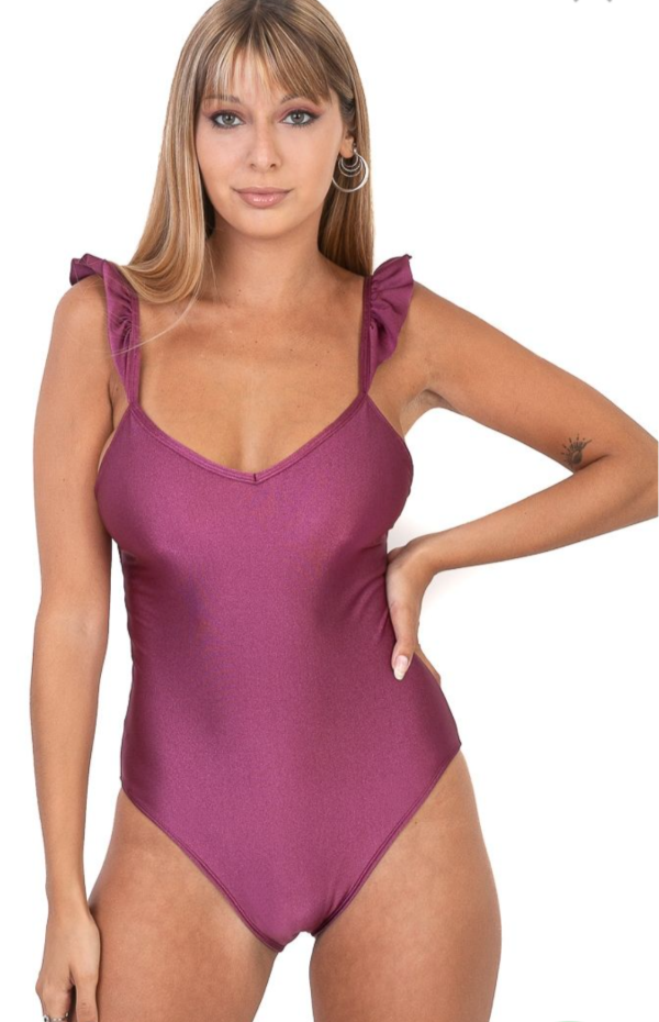 Enteriza vedetina con detalles de vuelitos en hombros y breteles regulables. Forrada completa. Tazas desmontables.