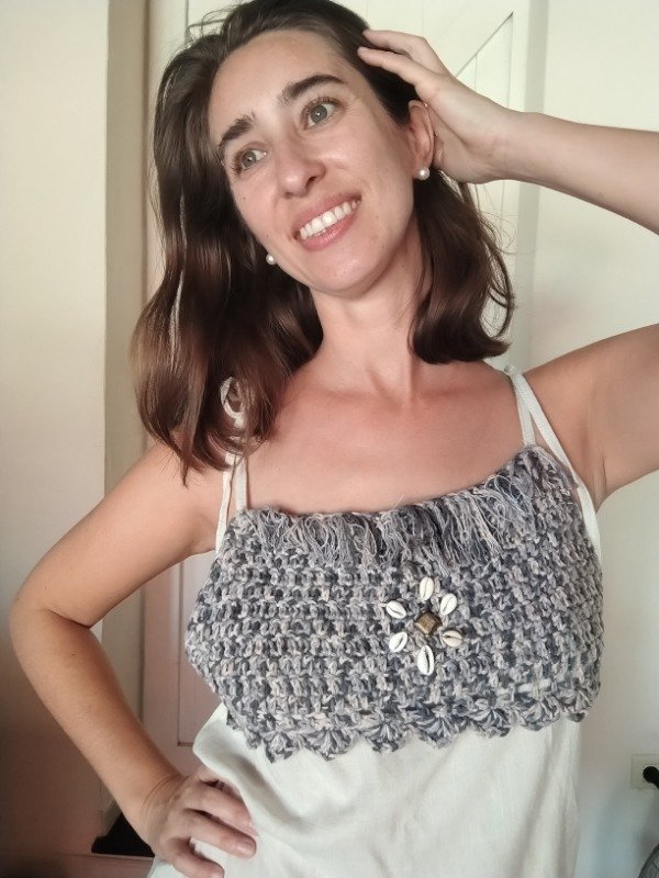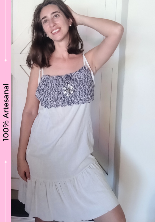 Vestido de Lino intervenido en Crochet con bordado de caracoles en el centro. Se regula con nuditos los breteles. 100% Artesanal
