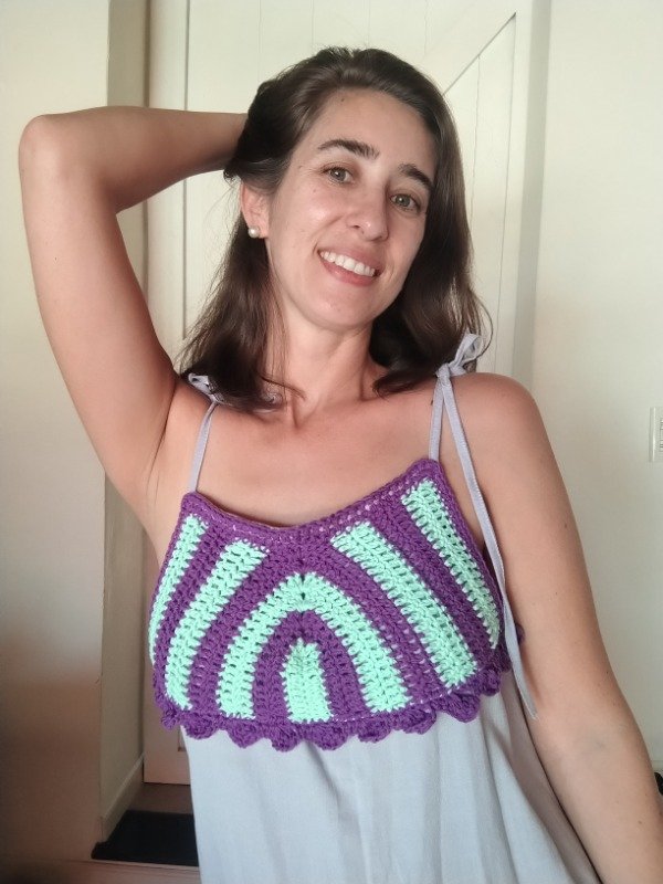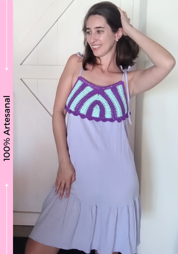 Vestido de lino con breteles que se regulan con nudos en el hombro. Intervenido 100% tejido a mano en Crochet.